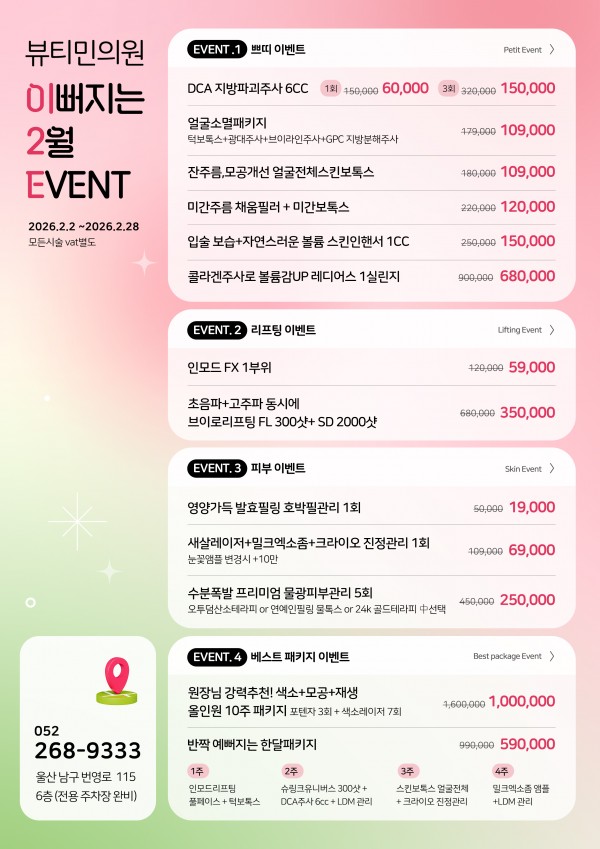 페이지 정보 작성자 뷰티민의원 댓글 0건 조회 580회 작성일 26-01-31 10:34 목록 본문 종료 2뻐지는 2월 이벤트♥ 2026-01-31 ~ 2026-02-28 2뻐지는 2월 이벤트♥ 이벤트 신청하기 이벤트 신청하기 이전글뷰티민 3월이벤트♥ 26.02.27 다음글2026년 새해, 더예뻐질 기회! 1월 이벤트 ♥ 25.12.31 댓글 0 댓글목록 등록된 댓글이 없습니다.